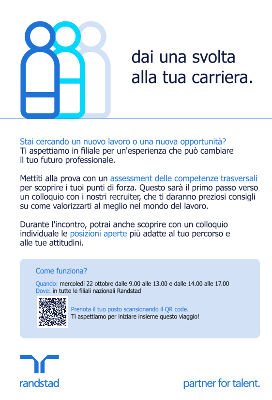mercoledì 22 ottobre, ultimo recruiting day nazionale dell’anno che si svolgerà in contemporanea presso le filiali di tutta Italia: in questa occasione, tutti i talenti avranno la possibilità di mettersi alla prova con un light assessment sulle competenze trasversali che permetterà loro di mettere in evidenza i punti di forza.