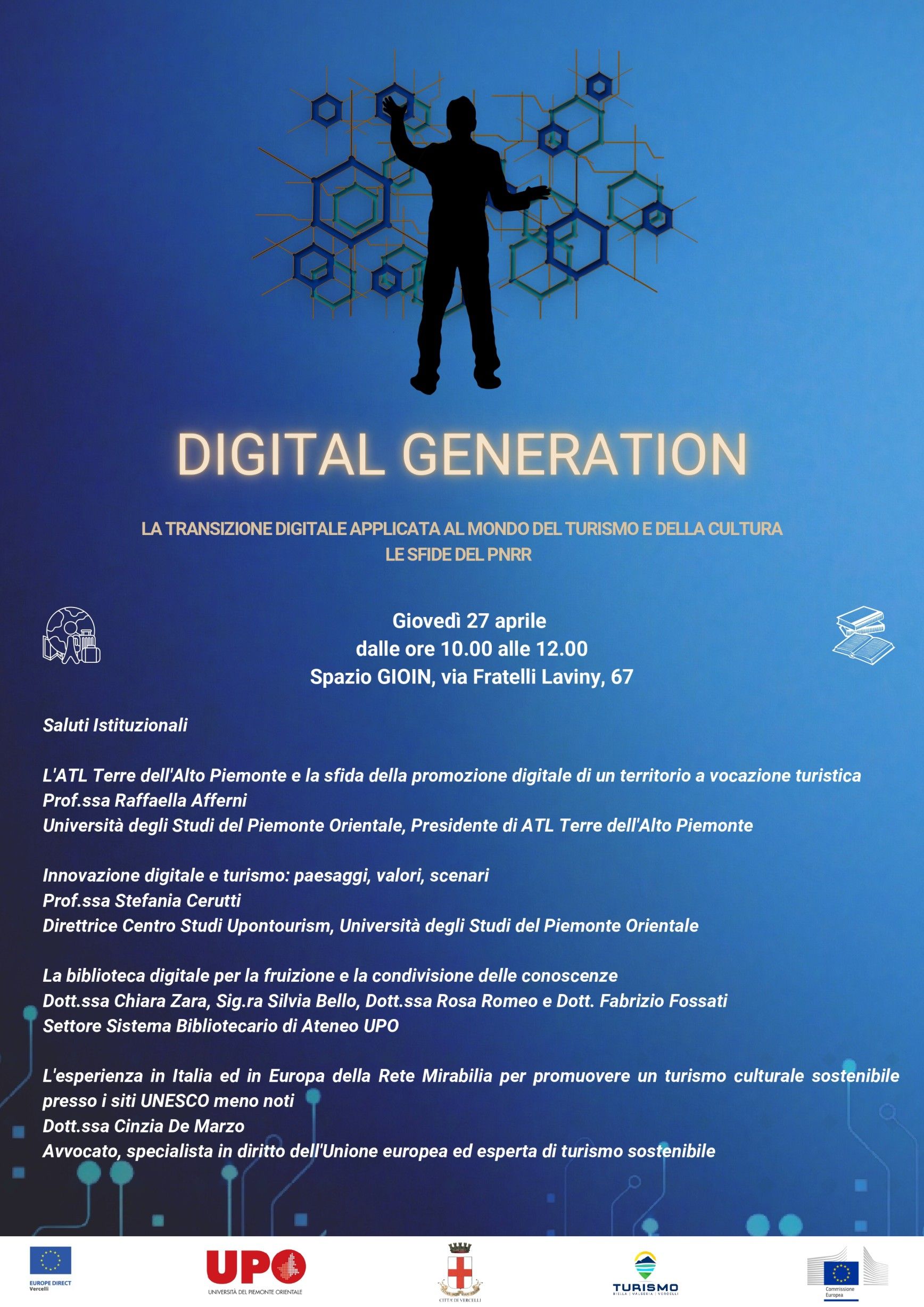 Nell’ambito del programma NextGenerationEU e dei progetti del Piano Nazionale di Ripresa e Resilienza, il Centro Europe Direct del Comune di Vercelli organizza, in collaborazione con la Rappresentanza della Commissione europea in Italia, l’Università degli Studi del Piemonte Orientale, l’Agenzia del Turismo Locale - Terre dell’Alto Piemonte, un evento per la giornata di giovedì 27 aprile dalle ore 10.00 alle ore 12.00 dal titolo “Digital Generation - la transizione digitale applicata al mondo del turismo e della cultura, le sfide del PNRR”, che avrà luogo presso lo spazio Gioin in via Fratelli Laviny 67, Vercelli.